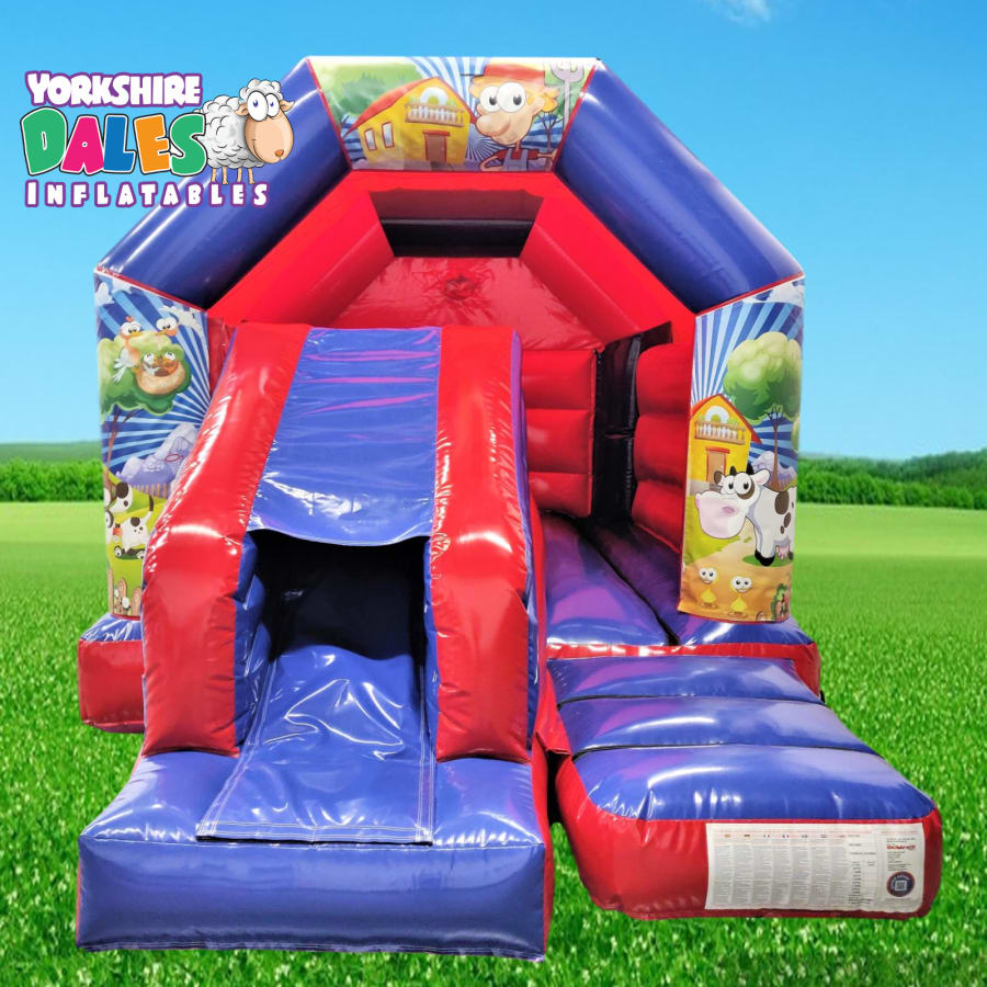 Farm Yard Theme Red & Blue Bouncy Castle With Slide - 11ft x 16ft