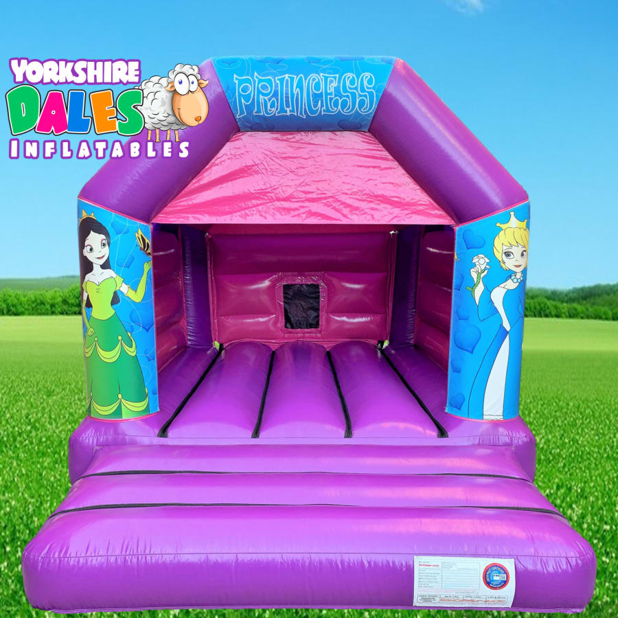 This Pink & Purple 11x15 bouncy castle hire can cater for around 20 children at the same time; however the numbers using the inflatable the same time should be around the 7 mark. All our inflatables have the correct number of users marked clearly on the inflatable to help with supervision. The inflatable is fully tested to meet strict Health and safety guidelines. It features a big inflatable safety pad at the front for parental supervision. The inflatable also comes with a built in rain cover to protect the children form either the sun or rain depending on the time of year, Yet still lets enough light in during indoor hires.