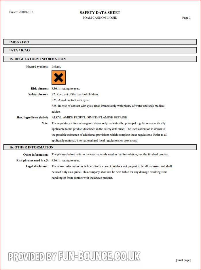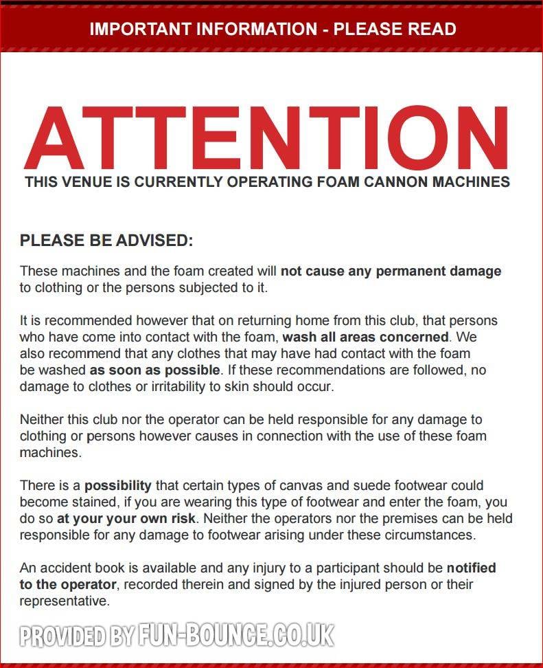 CAUTION MUST BE TAKEN AT ALL TIMES. PLEASE DO NOT BOOK THIS ITEM UNLESS YOU HAVE READ THE COSH REPORTS ON OUR HEALTH AND SAFETY PAGES. WE ALSO STRONGLY SUGGEST PRINTING THE COSH REPORT OFF AND DISPLAYING IT AROUND THE VENUE AS SOME PEOPLE CAN HAVE A REACTION TO THE FOAM.